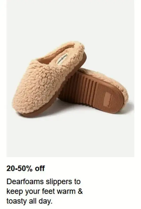 Stop by our store and get 20-50% off Dearfoams slippers.